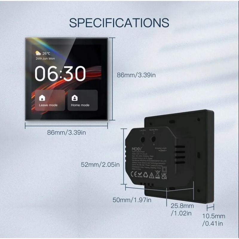 Bezvadu savienošanās iespējas: Wi-FI, Tuya app, Zigbee, Amazon Alexa (iebūvēta panelī)